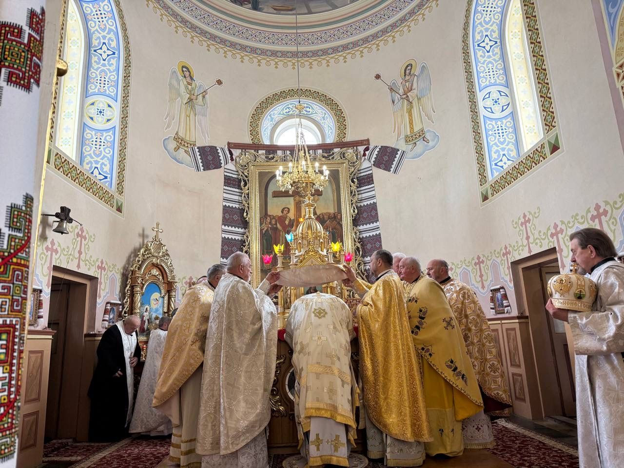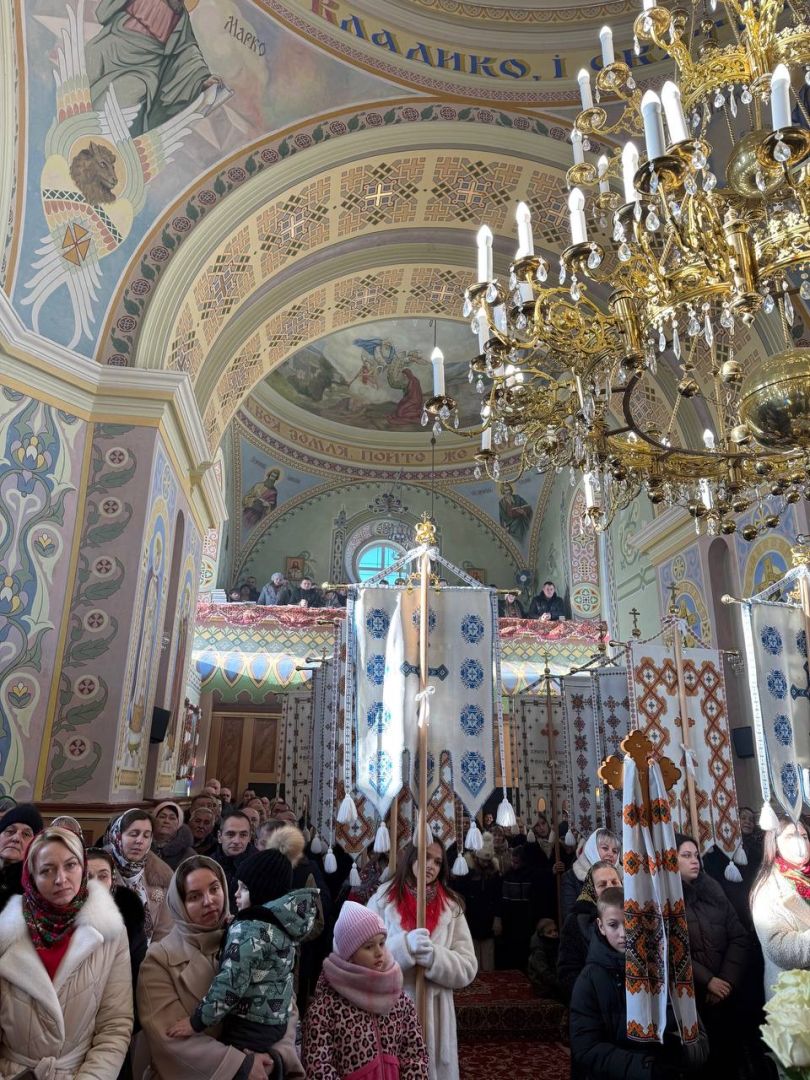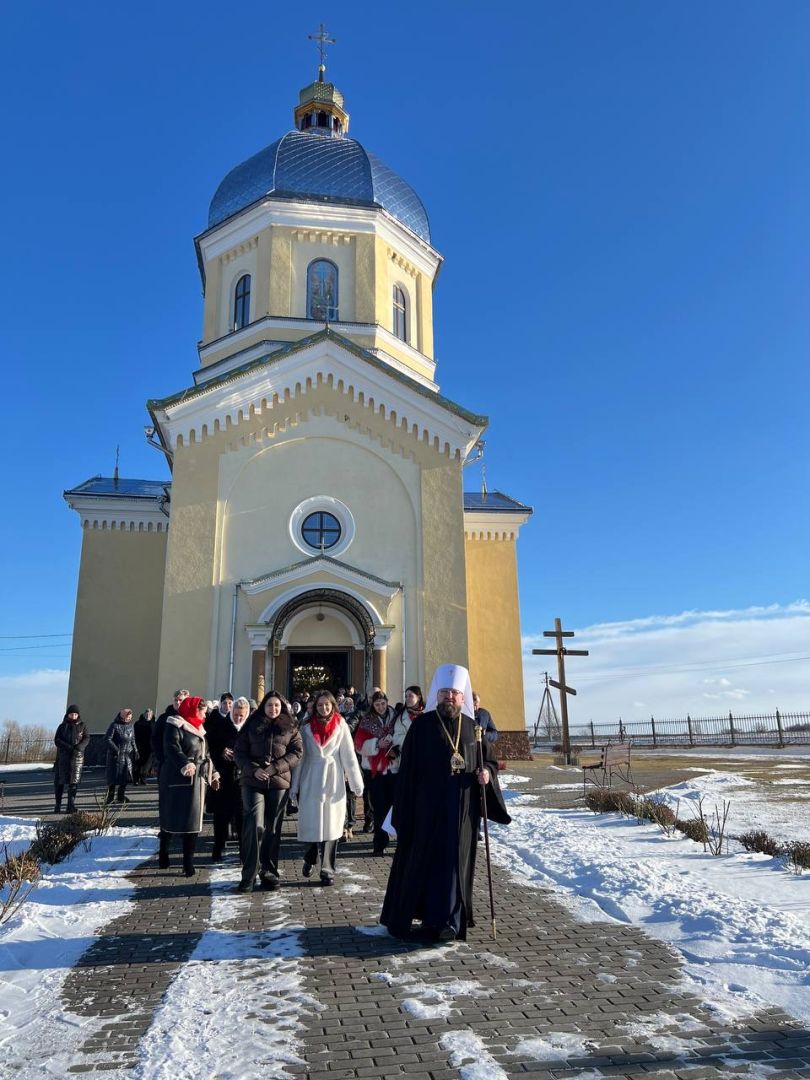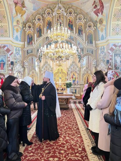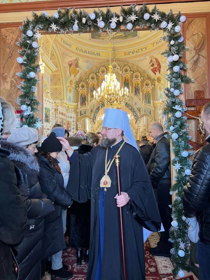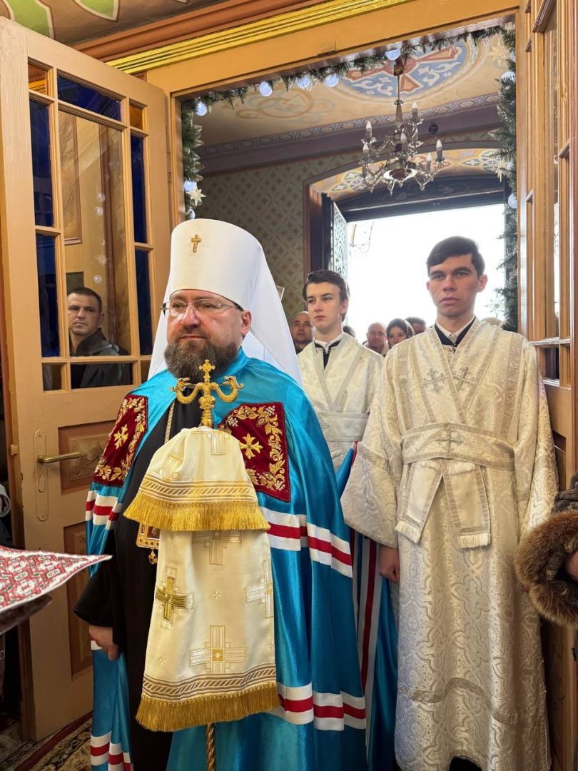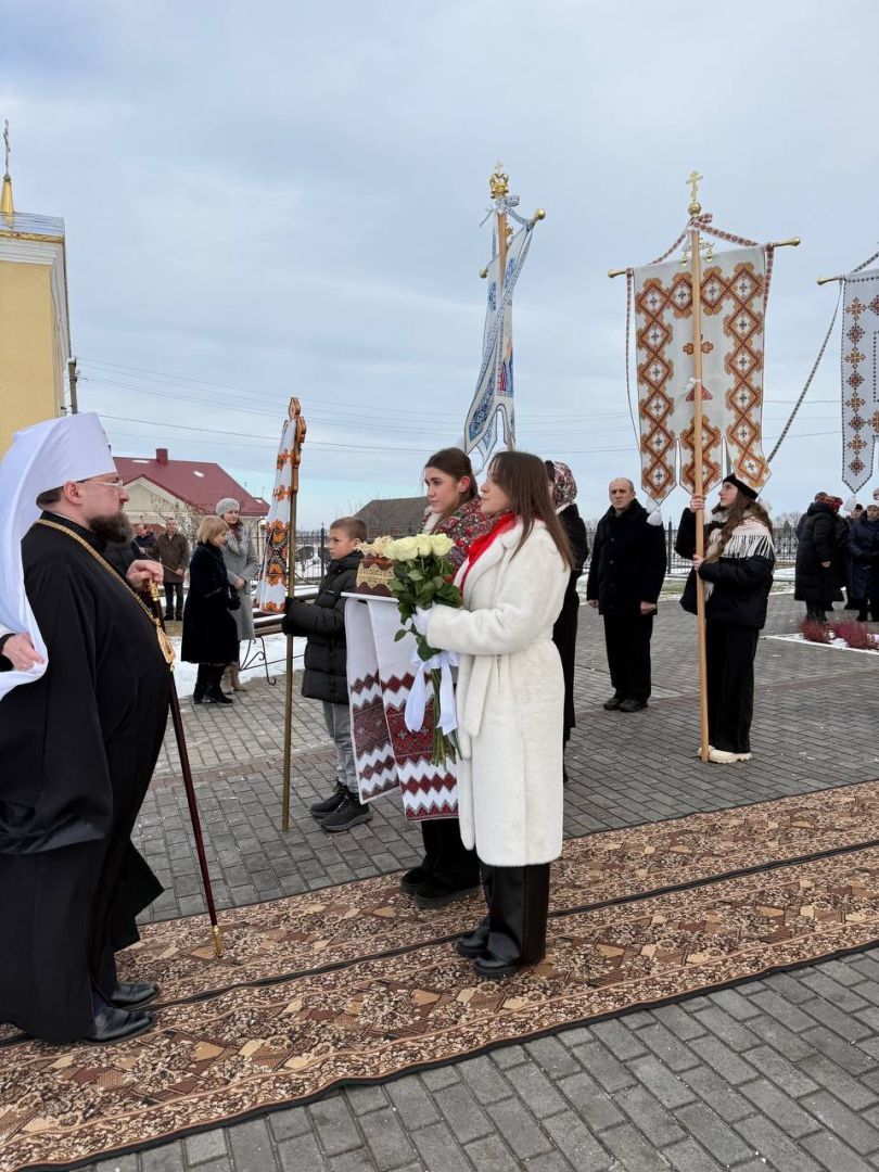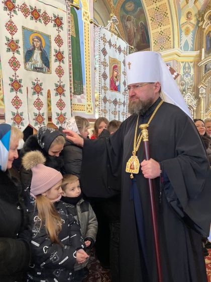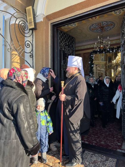 На подвір’ї храму з короваєм та вітаннями митрополита Димитрія зустріли парафіяни, а в притворі Владику щиро привітав настоятель храму, протоієрей Ярослав Шикула.