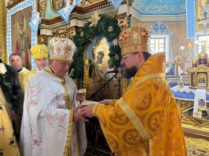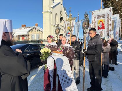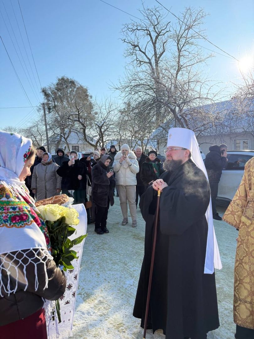 Перед входом до храму з короваєм, запашними квітами та вітаннями митрополита Димитрія зустріли парафіяни, а в притворі Владику щиро привітав настоятель храму - протоієрей Іван Бачало.