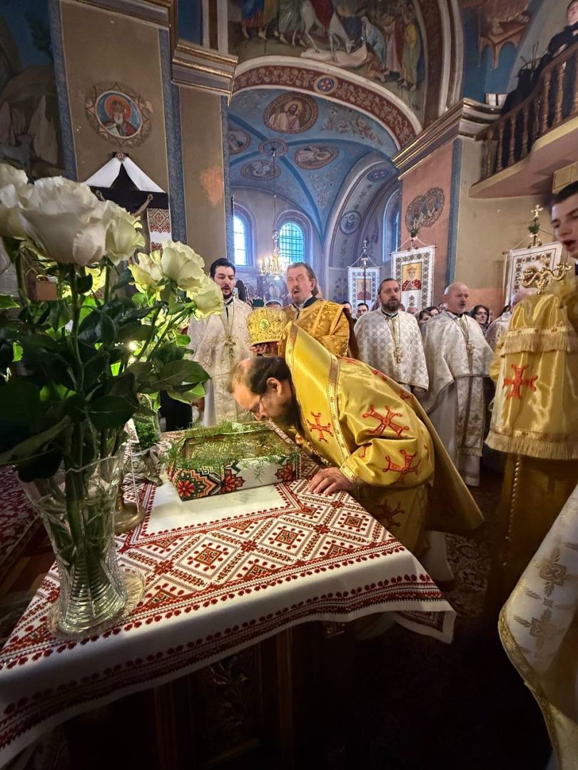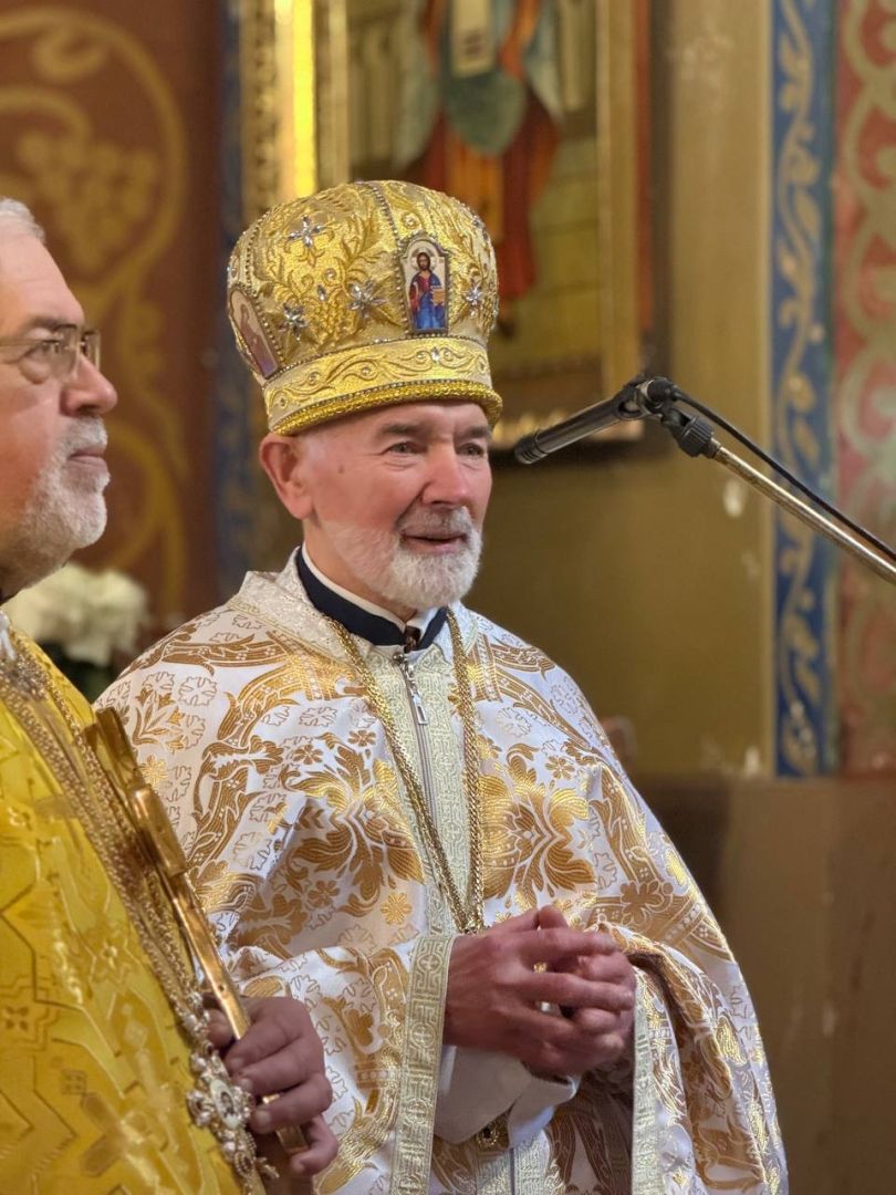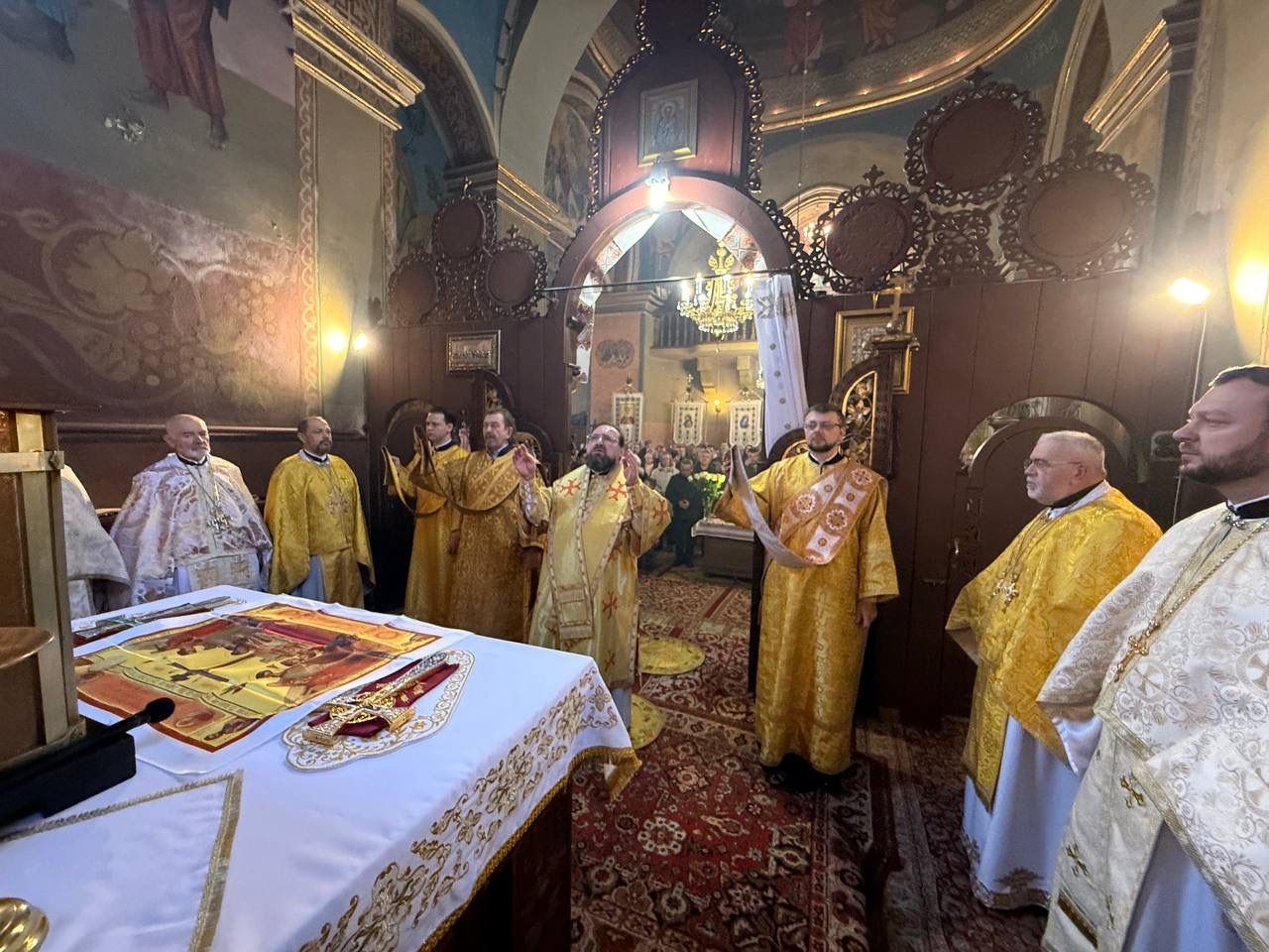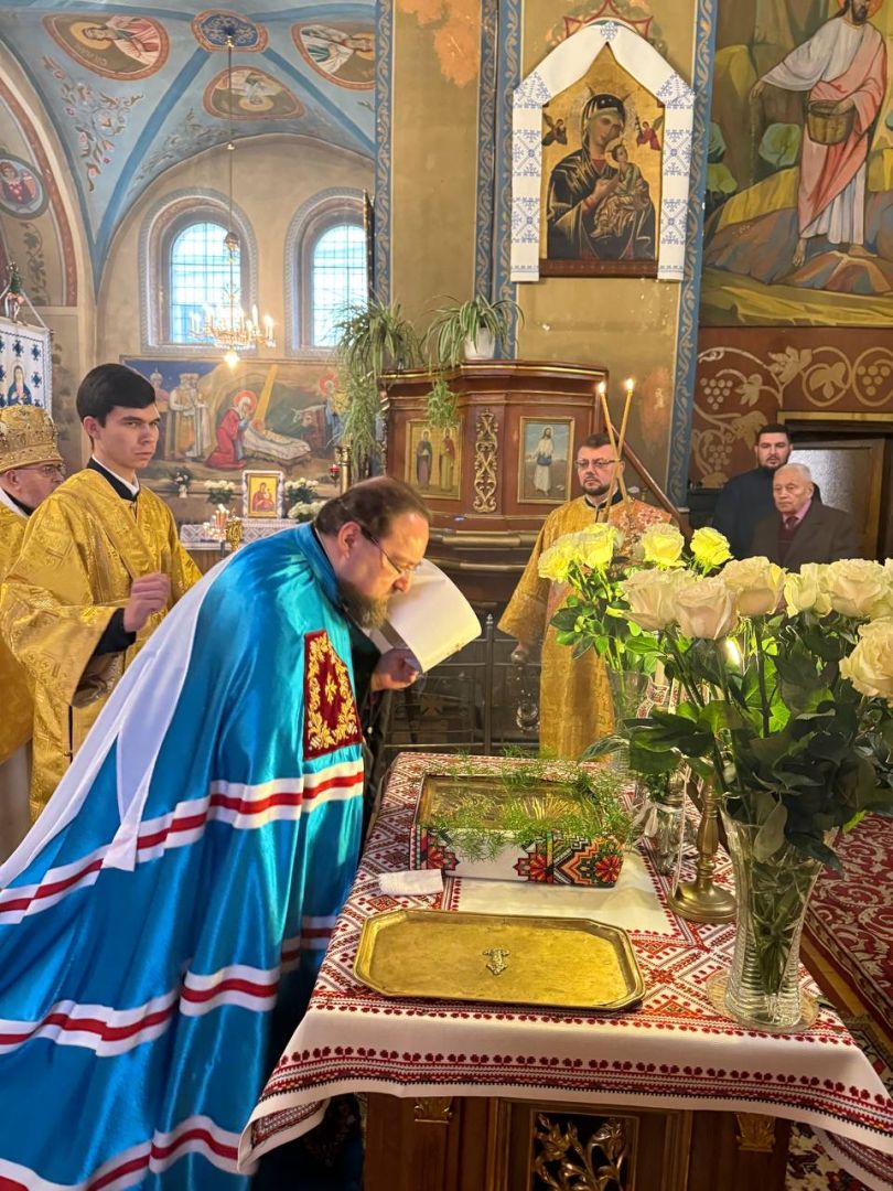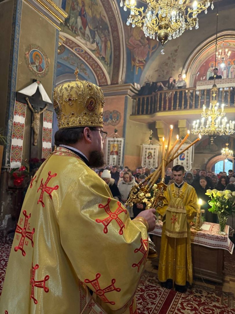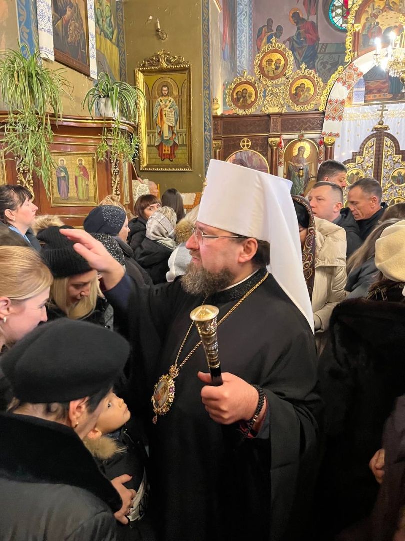 На храмовому подвірʼї із запашним короваєм архіпастиря зустріли парафіяни, а вже у самому храмі Владику привітав настоятель, протоієрей Ярослав Дуда.