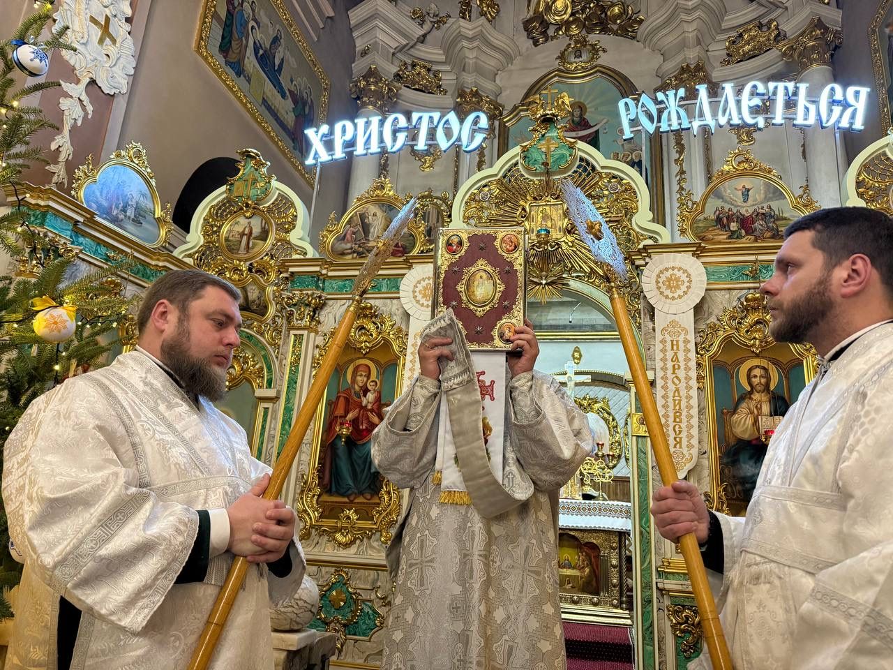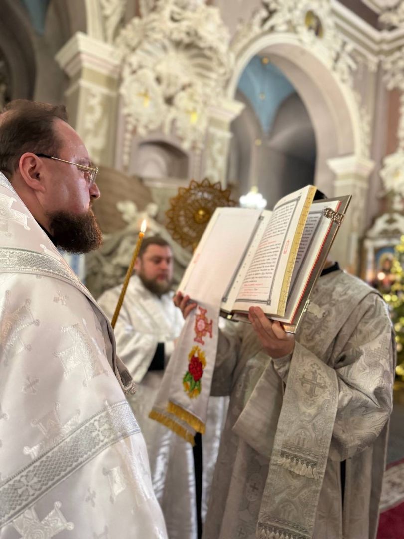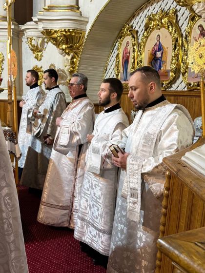 За вечірнім богослужінням Архієрею співслужили клірики собору та єпархії.