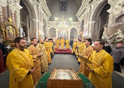 Його Високопреосвященству співслужили: архієпископ Володимирський і Нововолинський Матфей, архієпископ Хмельницький і Шепетівський Павло, секретар...