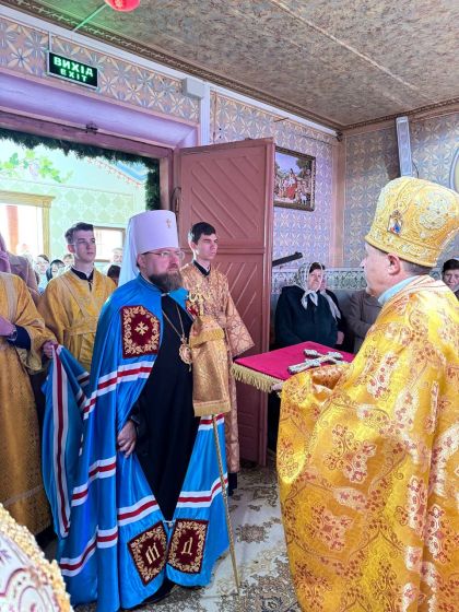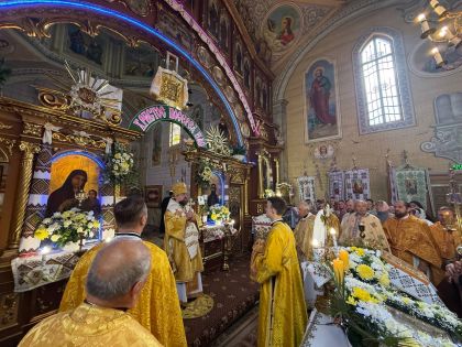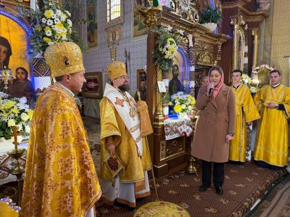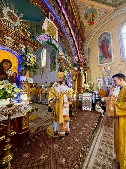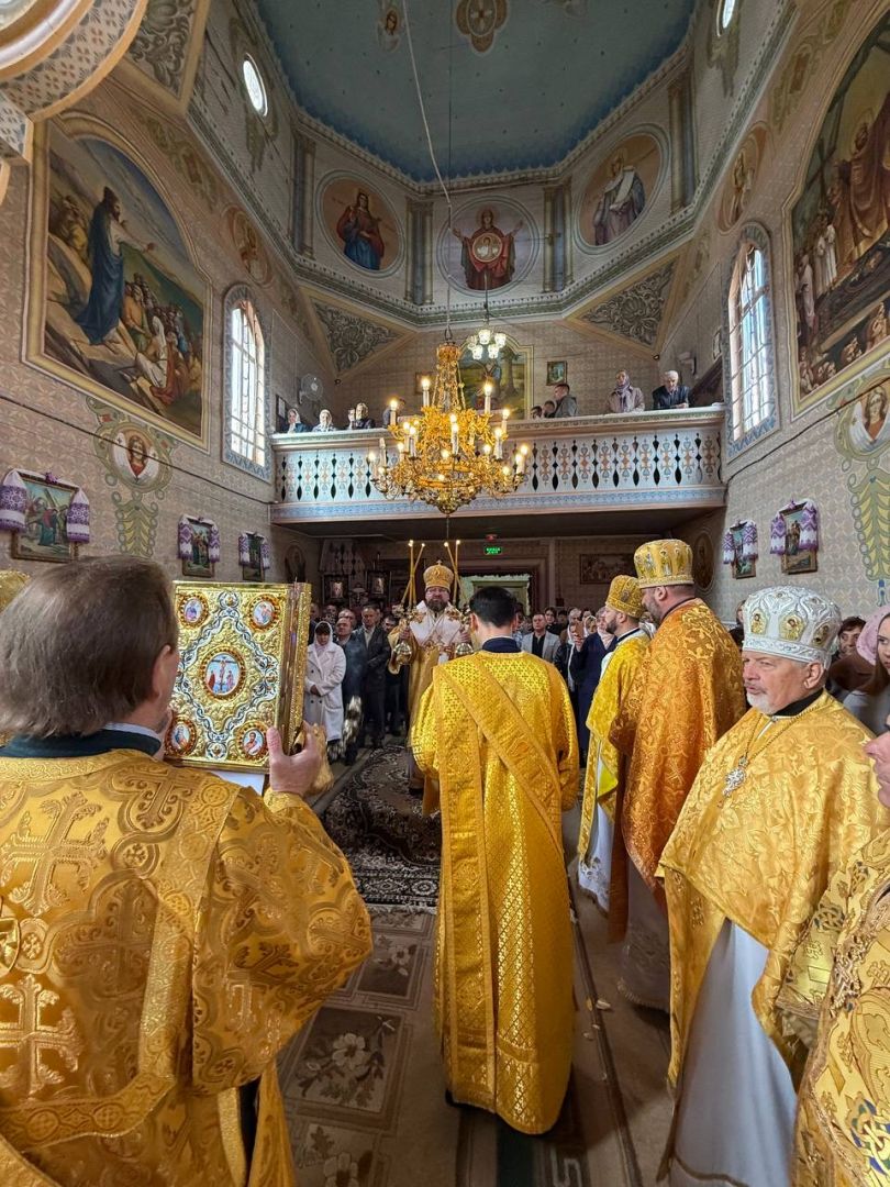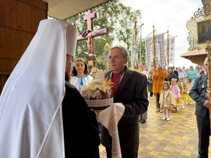 На подвір’ї храму з короваєм та вітаннями митрополита Димитрія зустріли парафіяни, а в притворі Владику зі словами привітань зустрів настоятель храму, протоієрей Петро Івасейко.