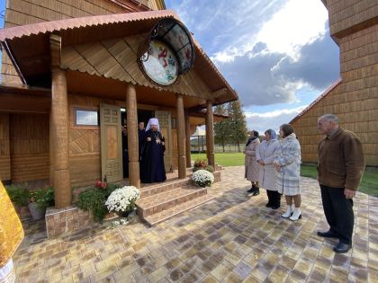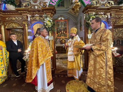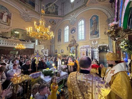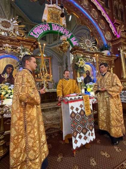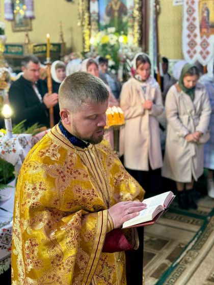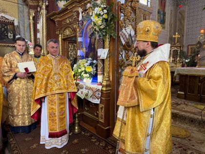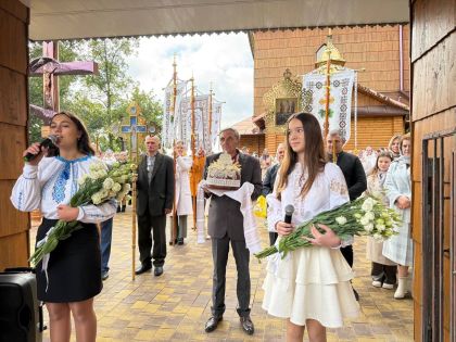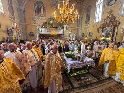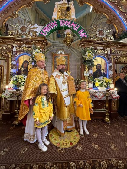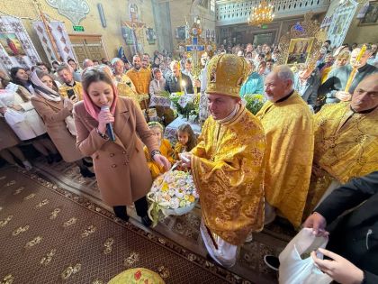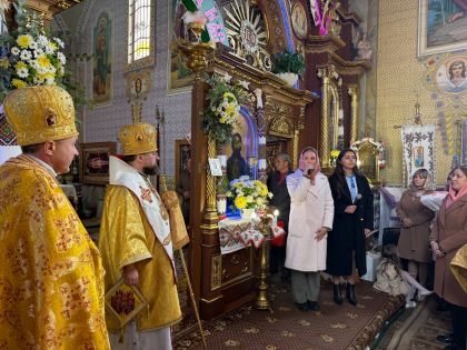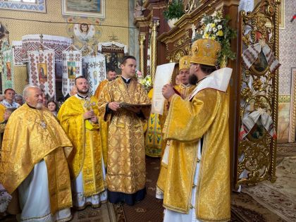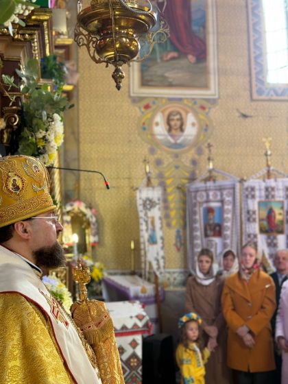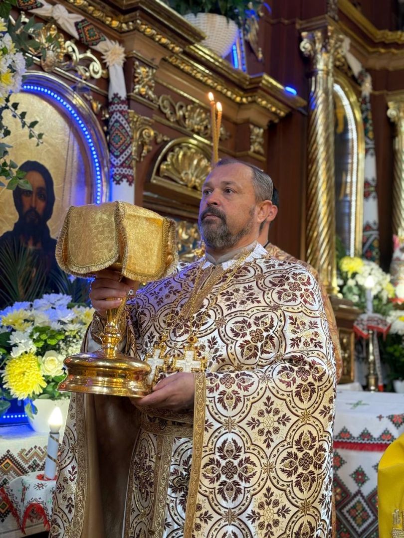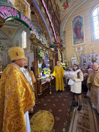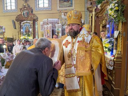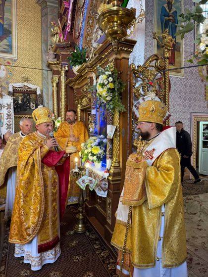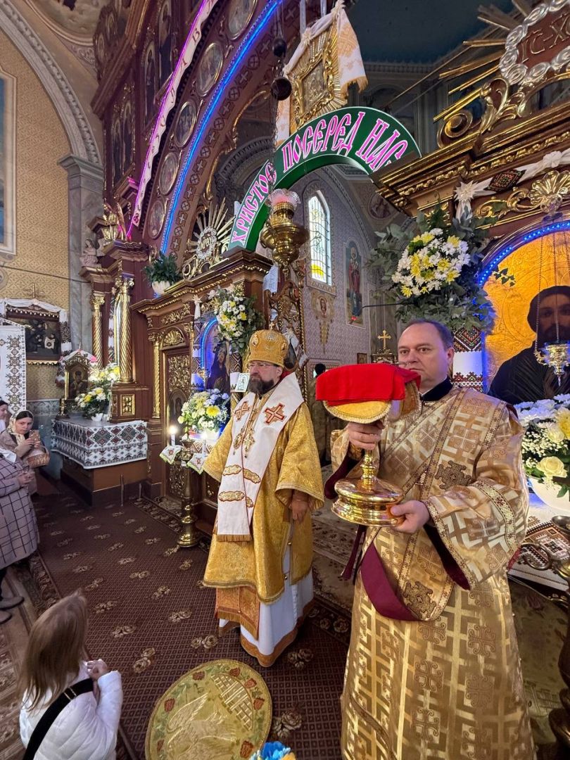 У свою чергу на адрес керуючого єпархії зі словом подяки за відвідини парафії та звершене богослужння звернувся настоятель храму, протоієрей Петро Івасейко та підніс Архієрею просфору та букет квітів.