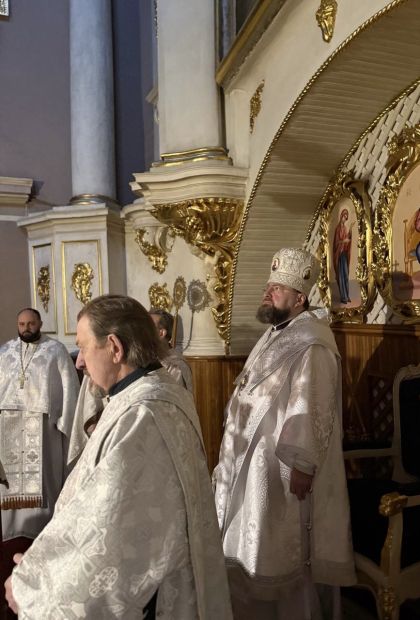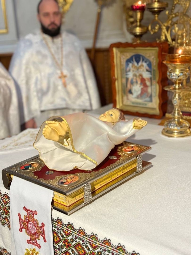 По завершенні Літургії і вечірні на середину храму була винесена ікона свята, перед якою Владика Димитрій разом із духовенством звершили чин славлення Різдва Христового, проспівавши тропар та кондак свята.