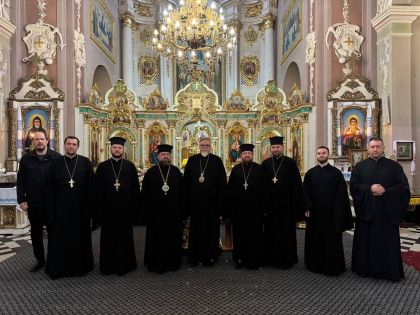 При вході до храму високого гостя зустріли: керуючий єпархією, Митрополит Львівський і Сокальський Димитрій, ключар кафедрального собору, т.в.о. ректора ЛПБА протоієрей Михайло Сивак, намісник Свято-Іоано-Золотоустівського монастиря, декан богословського факультету ЛПБА, архімандрит Кипріан Лозинський та клір собору.