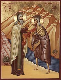 47 років неустанно молилась преподобна та вела строге аскетичне життя не зустрічаючи нікого з людей чи звірів. І лише за два роки перед її світлою кончиною, до неї у пустелю прийшов святий старець Зосима, благочестивий інок, який близько 50 років подвизався постом і молитвою та постійно навчався Божественних слів. Ангел Божий явився йому та вказав на преподобну марію Єгипетську, коли старець міркував чи є ще у світі людина, яка перевершила його у подвигах іночеських. Саме старцеві Зосимі преподобна і розповіла про своє життя і свій подвиг. Коли святий старець знайшов подвижницю, то побачив її нагою, бо за роки аскетства одяг її повністю обвітшав і так вона роками претерпівала мужньо всі зміни погоди в пустелі: то сонце немилосердно палило її, то холод просякав аж до кісток. Тіло було дотемна опалене сонцем, а волосся вигоріло і було біле мов агниче руно. Але такий стан умертвління плоті для преподобної був власне великою її перемогою над плотськими гріхами, перемогою духовного над тілесним. Випросивши у старця плащ, Марія розпочала розповідь – довгу, просякнуту щирим жалем за гріховне блудне життя та постійним проханням молитися за неї грішну.
